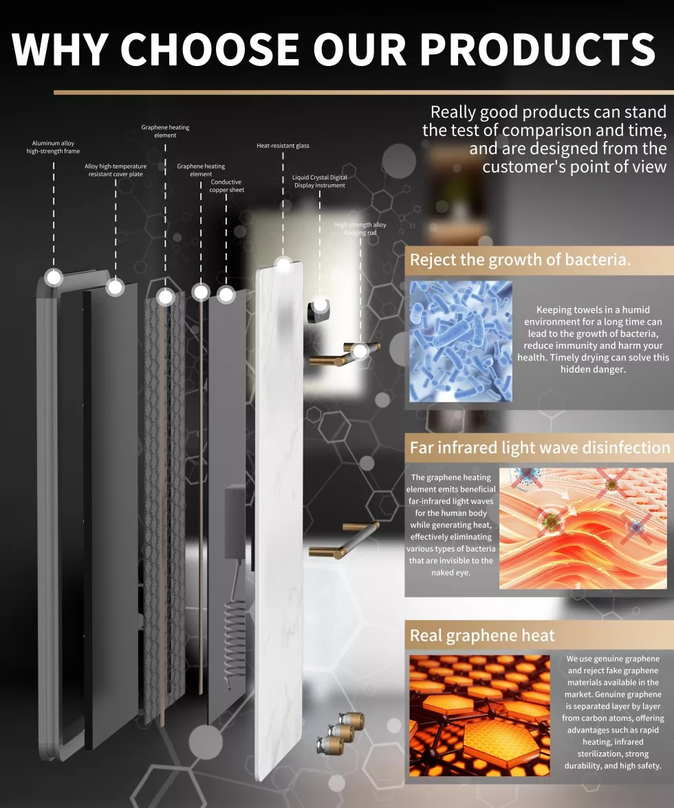 Como fabricante, o MESHOW lançou uma variedade de produtos domésticos populares com excelente tecnologia e artesanato requintado, entre os quais o rack de toalha elétrico de grafeno de 200W é particularmente atraente. Este produto integra tecnologia de ponta e estética moderna, revolucionando a experiência em casa. Usando grafeno como elemento de aquecimento do núcleo, ele atinge o aquecimento rápido devido à sua condutividade térmica ultra-alta. Uma vez ligado, as toalhas molhadas podem ficar secas em minutos, impedindo efetivamente o crescimento bacteriano e garantindo a saúde dos membros da família.