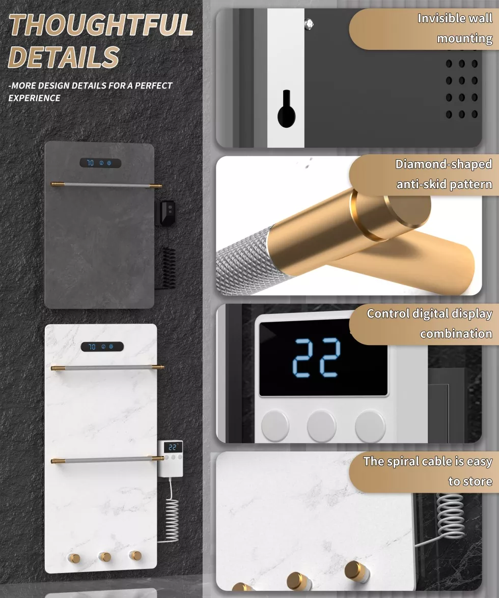 A combinação de painéis de rocha branca e postes pendurados em metal fosco é simples, mas elegante, adequado para uma variedade de decorações para casa. A textura natural e a textura geral da laje de rocha aumentam o nível do banheiro; Ipx4 à prova d'água, sem medo de gotículas de água, adequadas para espaços úmidos no banheiro. O rack de toalha de rocha de grafeno é secagem e eficiente, com esterilização do infravermelho distante e prevenção eficaz de bactérias e ácaros, mantendo as toalhas limpas. Padrão Nacional de Rocha de Grafeno Branco, garantia de três anos, bem-vindo a negociar!